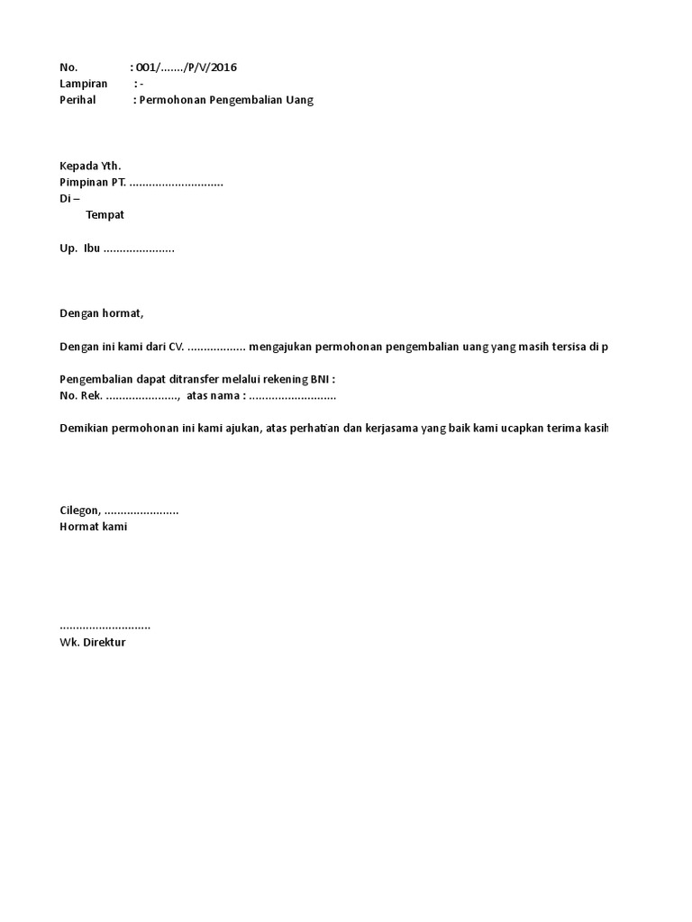 Adapun proses pengembalian dana talangan tersebut tetap mengacu pada peraturan presiden nomor 102 tahun basuki tak menampik, proses pengembalian dana talangan ini akan berlangsung lama. 1 permohonan untuk pengembalian barang/dana. .dalam pengembalian dana nasabah sesuai ketentuan pembubaran reksa dana. Mohon untuk diproses pengembalian dana tersebut dapat dikirimkan ke rekenin aston sebagai. Contoh surat permohonan bantuan dana pembangunan masjid kuasa refund tiket kereta api uang muka perjanjian hutang piutang 10 izin kerjasama.
